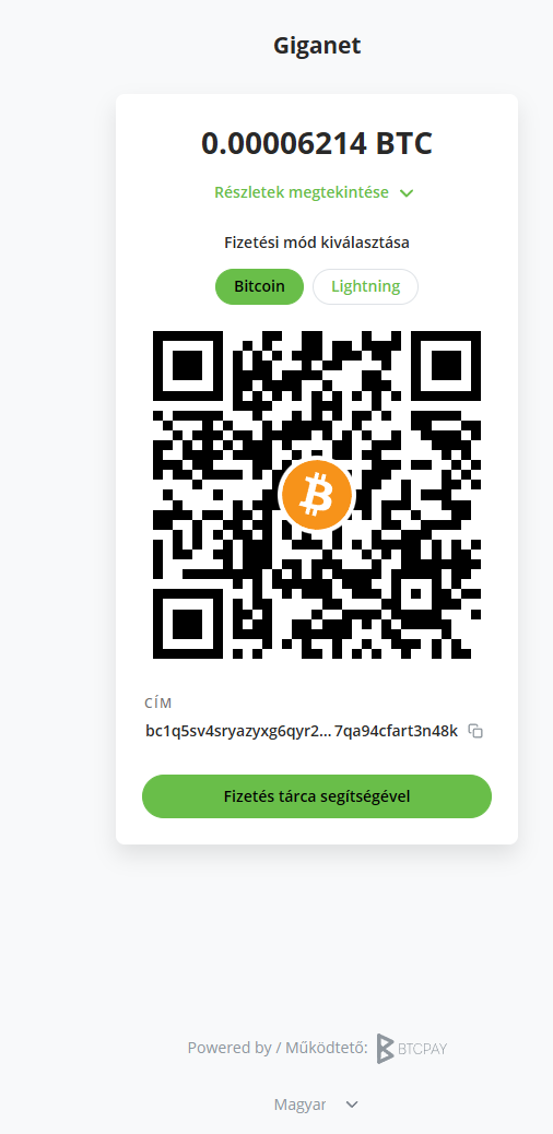 A rendszer átirányítja a felhasználót a BTCPay fizetési oldalra.